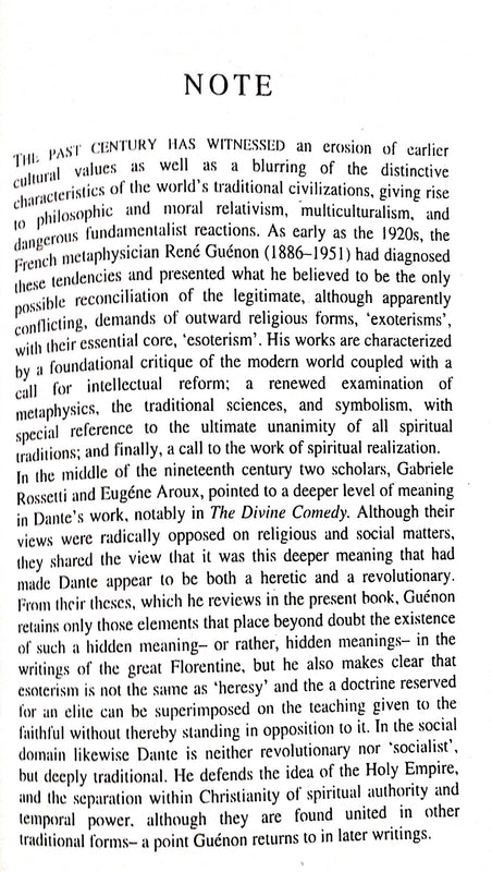 *** This volume collects under a single cover a number of seminal essays dealing with the subject and also with certain concrete manifestations of Christian esoterism in the medieval period. Without pretending to be thorough on so inexhaustible a subject, this important work of Guenon casts an unexpected light onto a specifically esoteric and initiatic aspect of Dante’s work, and above all of his Divine Comedy. Dante was without doubt far more than a literary genius, and one is justified in thinking that many treasures remain to be discovered in what Guenon calls ‘the spiritual testament of the Middle Ages.’ The author undertakes to establish that the three divisions of The Divine Comedy represent stages of initiatic realization and testify to Dante’s knowledge of traditional sciences unknown to the moderns: the science of numbers, of cosmic cycles, and of sacred astrology. He also touches on the all-important question of medieval esoterism, and corrects the errors of earlier scholars who had only glimpsed the deeper meaning of Dante’s work— providing an entirely new explanation of numerous points not previously elucidated.