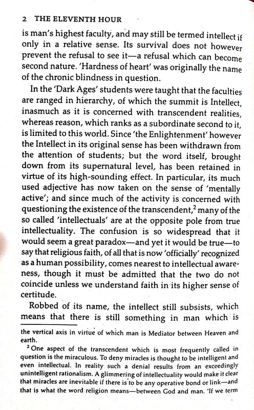 The Spiritual Crisis of the Modern World in the Light of Tradition and Prophecy Martin Lings The Eleventh Hour gives us from the outset powerful reasons for believing that we have now reached a point in time from which `the end’— whatever that may mean— is already in sight without being immediately imminent. In other words, we are now at an hour, which is neither the tenth nor the twelfth. The ‘twelfth hour’ will mark the conclusion, not of time as a whole, btit of one of the great cycles of four ages, which will be followed by another such cycle; and he argues that what Judaism, Christianity and Islam call ‘the end of the world’ can be understood in the same non-absolute way. He analyses first of all the negative aspects of the modern world, then its positive aspects, showing it to be, all things considered, far worse and yet far better than is generally supposed. The future is touched on no more than briefly, but our attention is drawn to a considerable weight of prophetic evidence that we are on the brink of a world-wide devastation. But despite these ‘days of destruction’, after which a brief positive aftermath is also predicted, and despite some of the appalling evils of the present, most reade