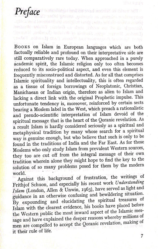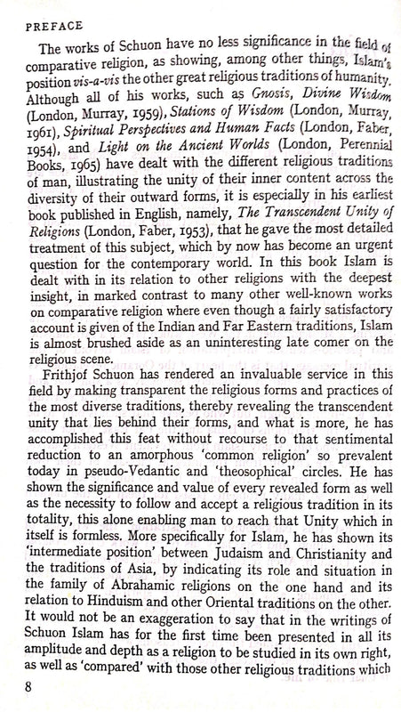 Frithjof Schuon’s earlier work Understanding Islam has been widely acclaimed for its unique insight into what is perhaps the least understood of the great Religions. It would not be an exaggeration to say that, in the writing of Schuon, Islam has for the first time been presented in all its amplitude and depth as a religion to be studied in its own right. This book brings to light some important but lesser known aspects of Islam and, like Understanding Islam, is written from a predominantly Sufi point of view. One is made to feel that a religion is like a living organism in which all the parts, both inward and outward are intimately related…..there is a continual movement from inward truth to outward or concrete symbol, from centre to circumference and back again to the centre. A striking example of this is to be found in the chapter on the Sufi doctrine of the five Divine Presences.