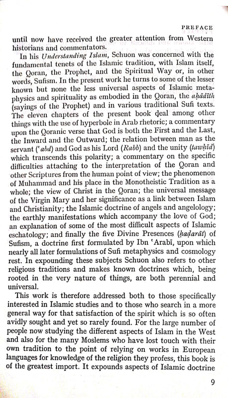 Of particular interest to Western readers will be the chapters on Christ and on the Virgin Mary, who for Muslims as well as for Christians is the summit of the hierarchy of women. There are also important chapters on the interpretation of the Qur’ān, and on the Prophet Muhammad and his place in the Monotheistic Tradition as a whole. As usual in the author’s writings, the book is rich in references to other religions; to Hinduism, Buddhism and particularly to Christianity.