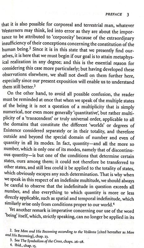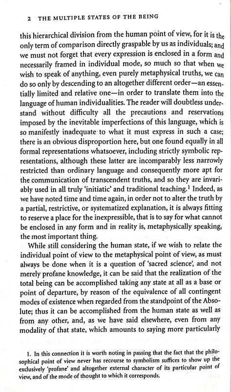 one of Guenon’s major works, treats a truly fundamental idea: the soul’s freedom lies in discovering its own nature as essential self-cognition and realising that all other states of knowledge and being are available to it as within itself. The metaphysics presupposed in such a realisation is discussed with thrust, brevity and incisiveness characteristic of the grand traditional style. The Multiple States of Being is the companion to, and the completion of The Symbolism of the Cross, which, together with Man and His Becoming According to the Vedanta, constitute Rene Guenon’s great trilogy of pure metaphysics. In this work, Guenon offers a masterful explication of the metaphysical order and its multiple manifestations—of the divine hierarchies and what has been called the Great Chain of Being— and in so doing demonstrates how intellective or intrinsic knowledge of what is, and of That which is Beyond what is, is a Way of Liberation. Guenon, the metaphysical social critic, master of arcane symbolism, comparative religionist, researcher of ancient mysteries and secret histories, summoner to spiritual renewal, herald of the end days, disappears here. Reality remains.